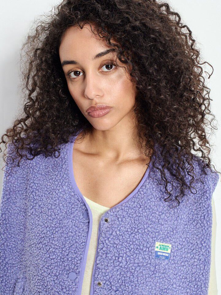 Crafted from 100% recycled polyester with a plush shearling-effect finish, the vest is soft, cozy, and lightweight enough for effortless layering. Its modern boxy shape is complemented by clean lines, subtle snap-button closures, and discreet slit pockets. The signature AMV House patch adds a touch of authenticity and refinement.