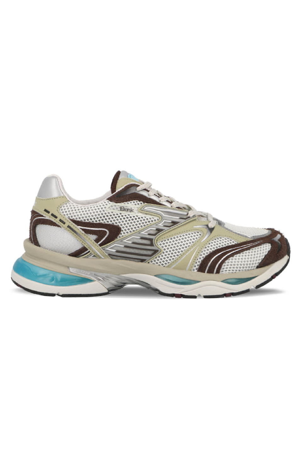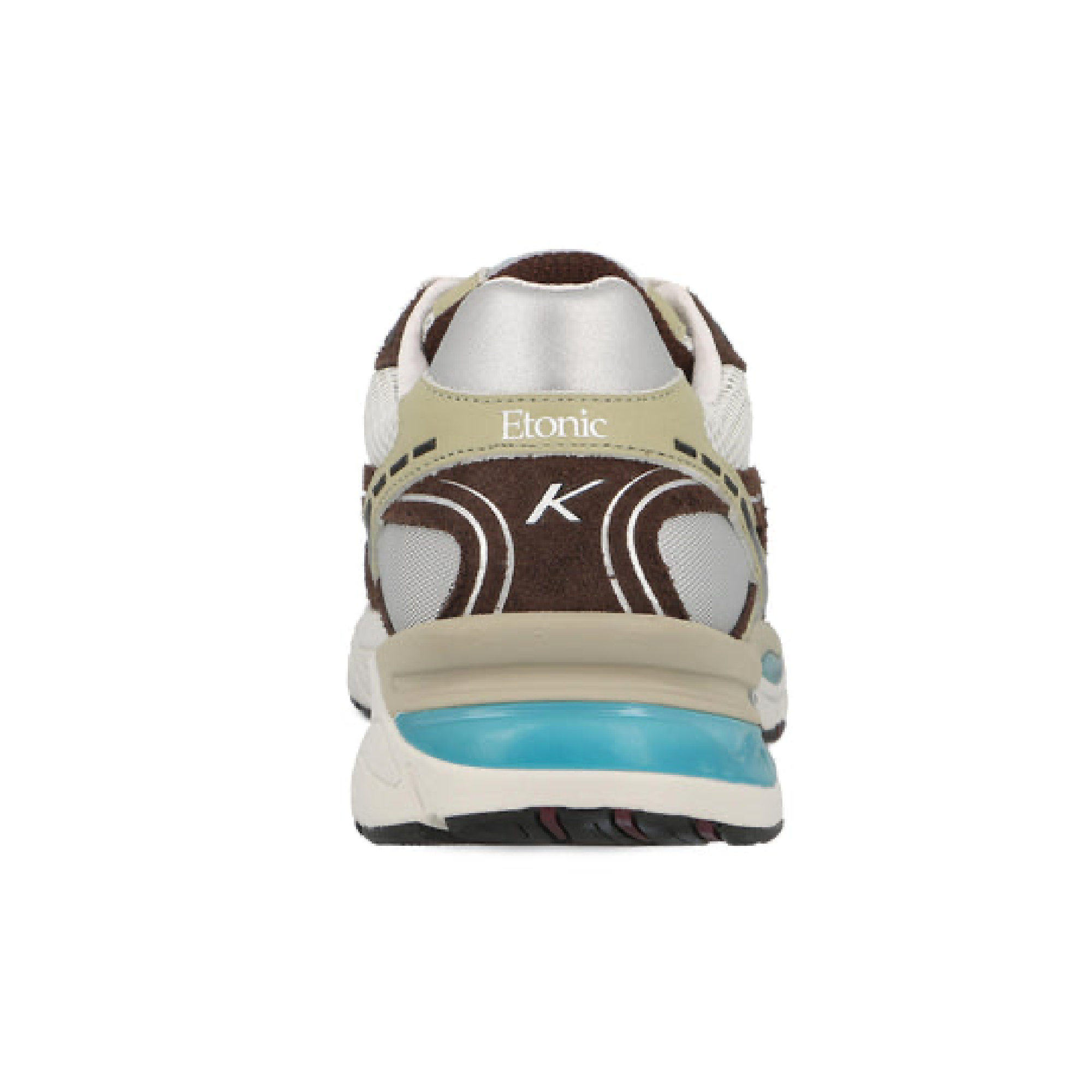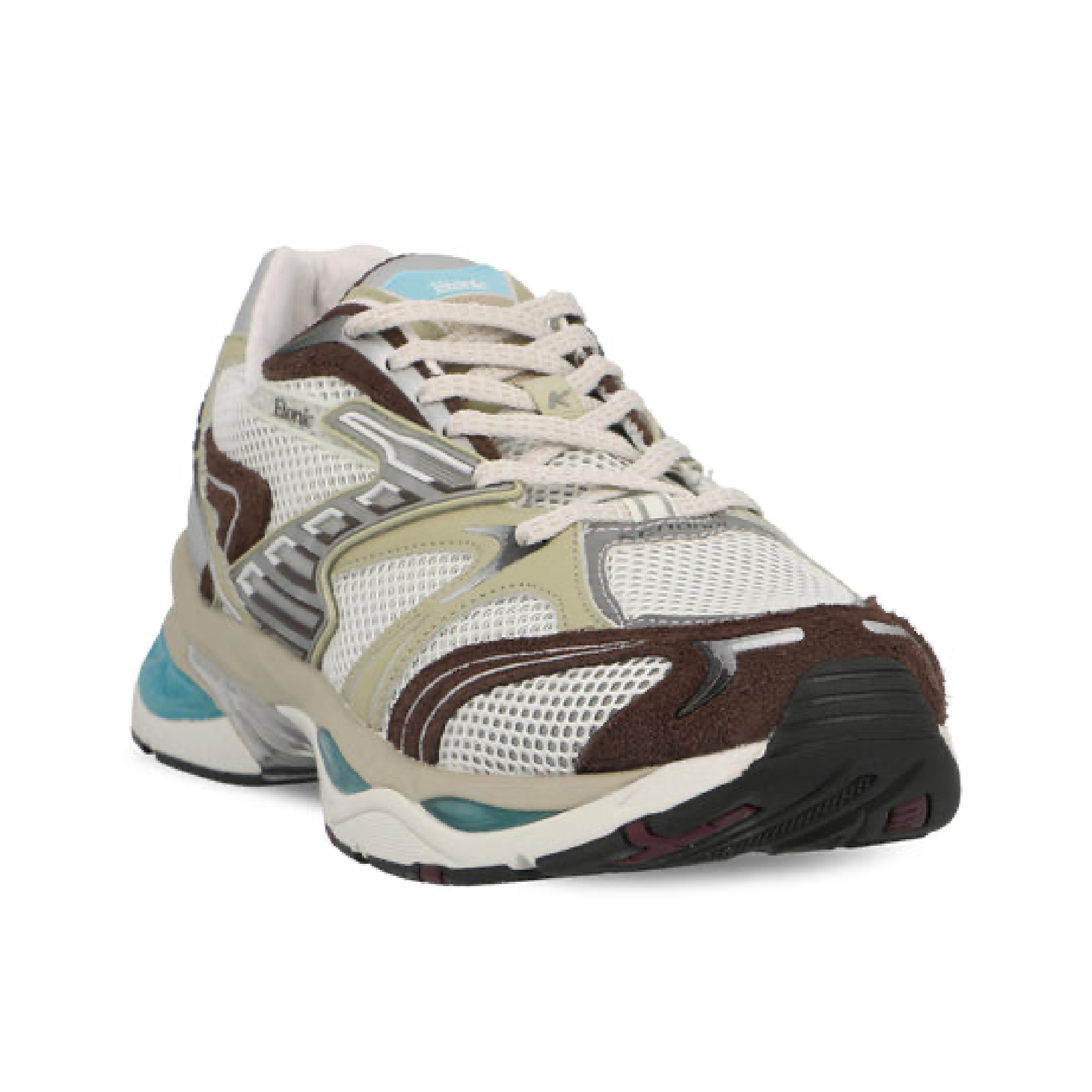 Refined yet bold, the Etonic Kendari 3.0 Turtledove blends cutting-edge design with earthy tones and futuristic accents. The breathable white mesh upper is elevated by taupe and chocolate suede overlays, pale green detailing, and aqua-blue inserts on the midsole for a unique, organic aesthetic.