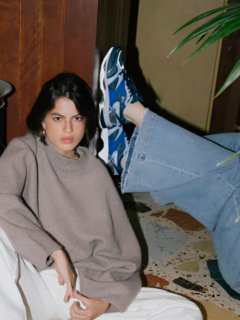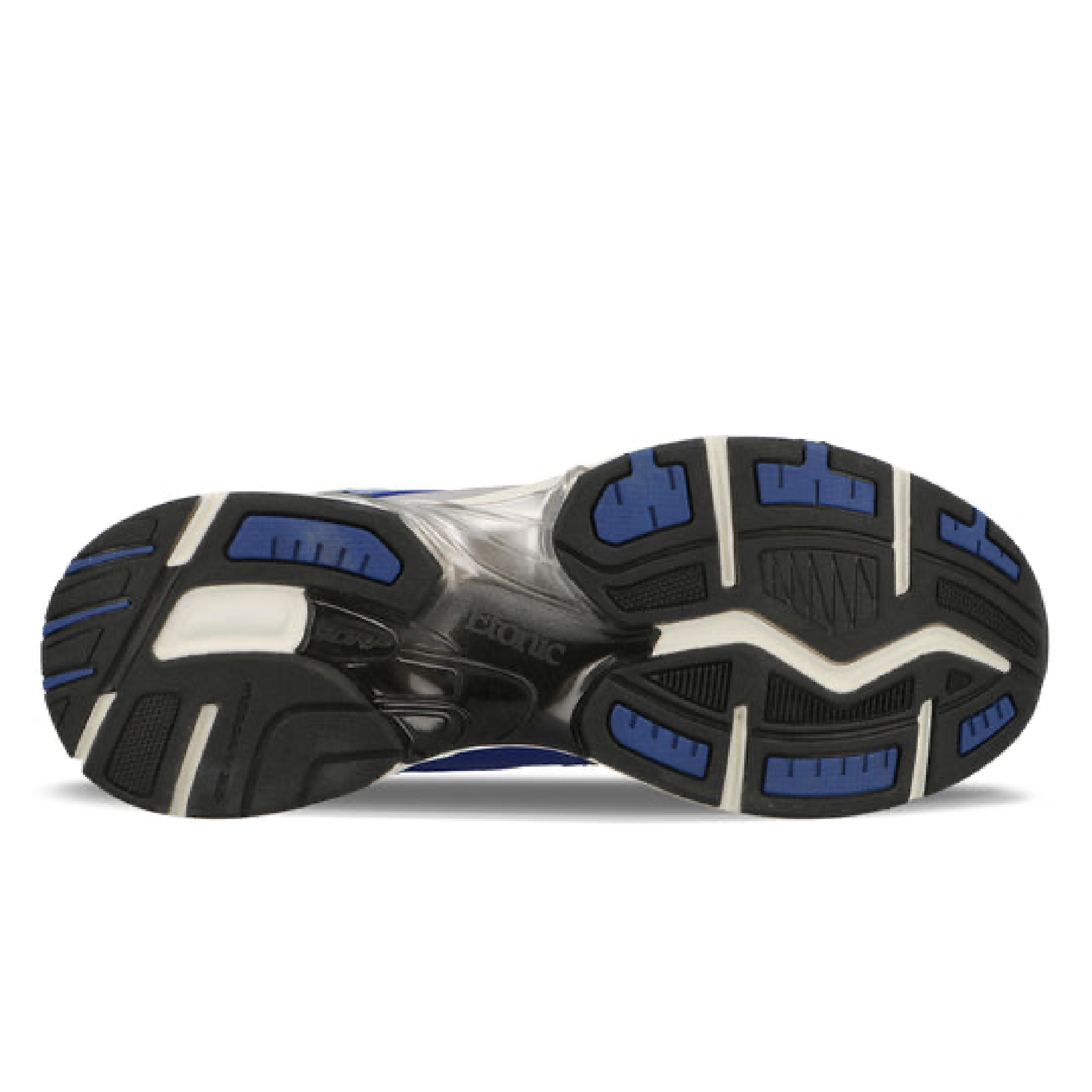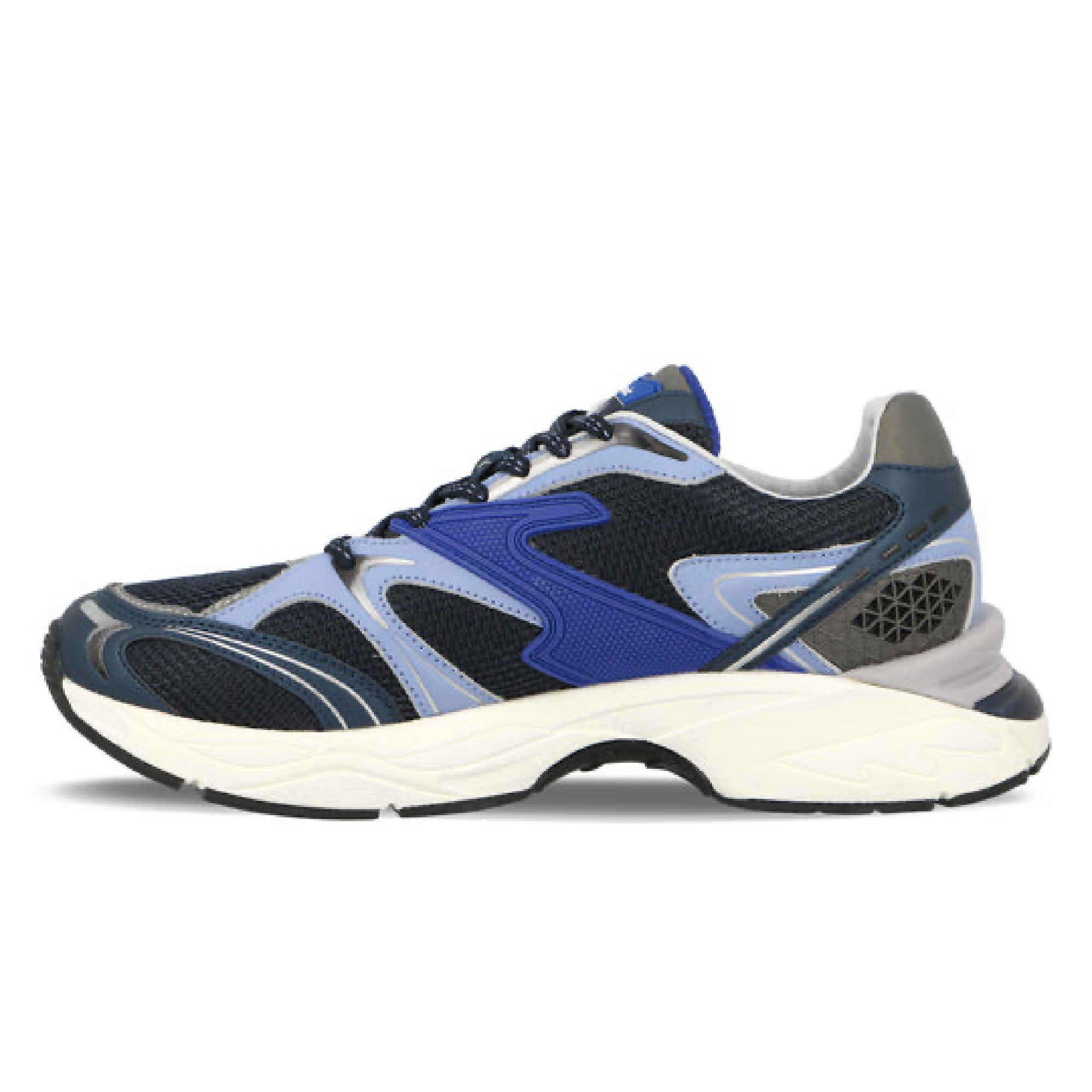 - Sculpted midsole in grey and white with deep indigo heel insert