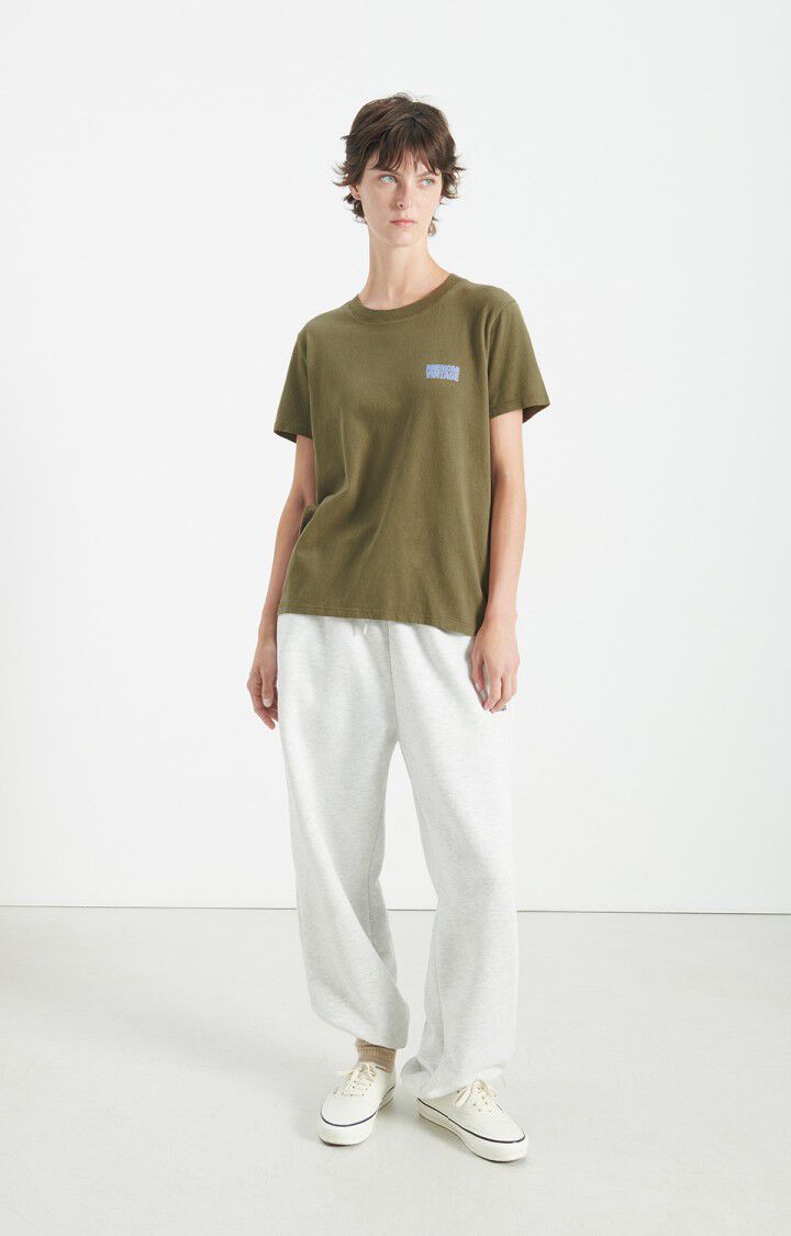 The color “Oregano” is a soft olive green shade — offering a slightly washed, relaxed look. This makes it exceptionally easy to style and gives the t-shirt a naturally worn-in, effortless character.
