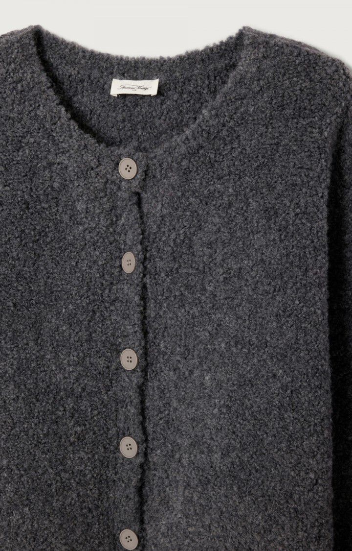The Zolly Cardigan in Metal Grey by American Vintage is a standout piece that combines bold texture with modern femininity. With its cropped length and loose, voluminous fit, it delivers a cosy yet effortlessly stylish silhouette—perfect for layering throughout the season. Crafted from a dense, soft Italian bouclé yarn, it offers warmth, comfort, and a visually rich knit structure that elevates any look.